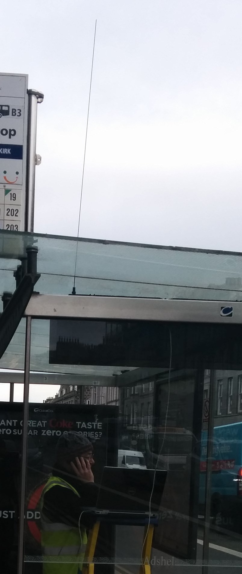 It looked like the tech was using a serial cable from his laptop up to the display. The antenna on the bus shelter looked much larger than the normal ones.