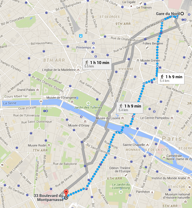 With the 30°C heat at 1800 it was probably a little long for a 6Km walk through the city. But the walk was very fortuitous if I had been down in the metro I wouldn't have seen the stunning sights of Paris, large buildings, street gangs, passed out tramps that have pissed them selves and the myriad of cheap suit shops. Shiny silver suits are a steal at 50€.