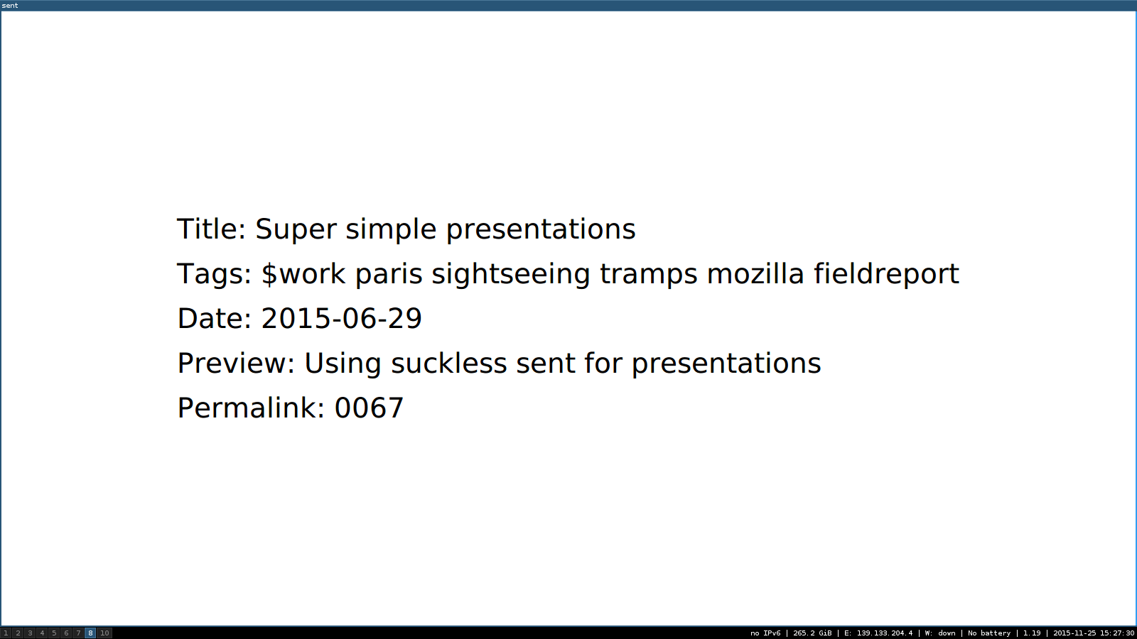 At the start of the nycbug thread suckless sent is mentioned. sent is a really simple presentation tool that, it takes some input files and shows them as a slideshow. No pdf output, no templates, just a presentation.
