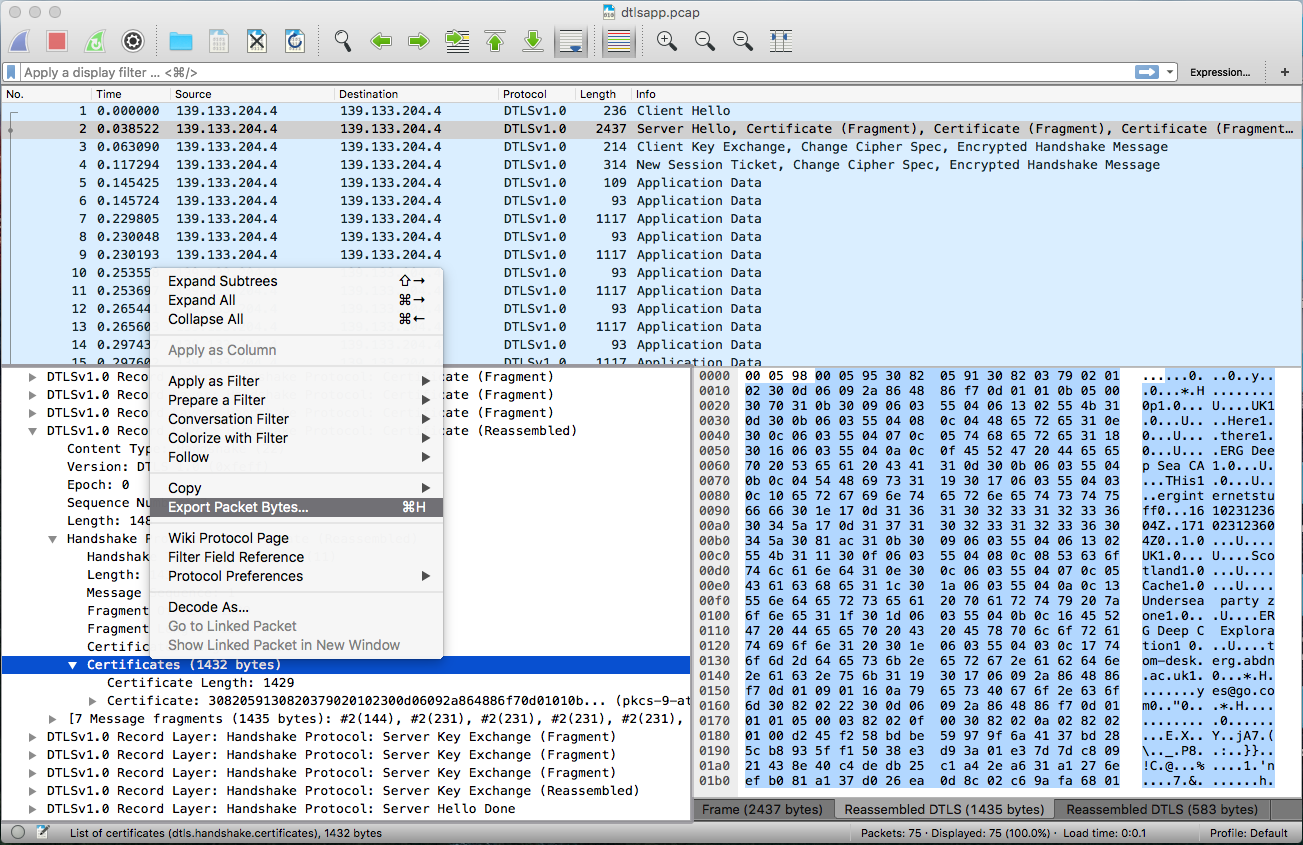 I had trouble gettting server certs to work correctly with DTLS, thankfully Wireshark can reassemble the datagrams into a coherent certificate and export the data out to a file. I can use this to manually check the cert is being sent correctly.
