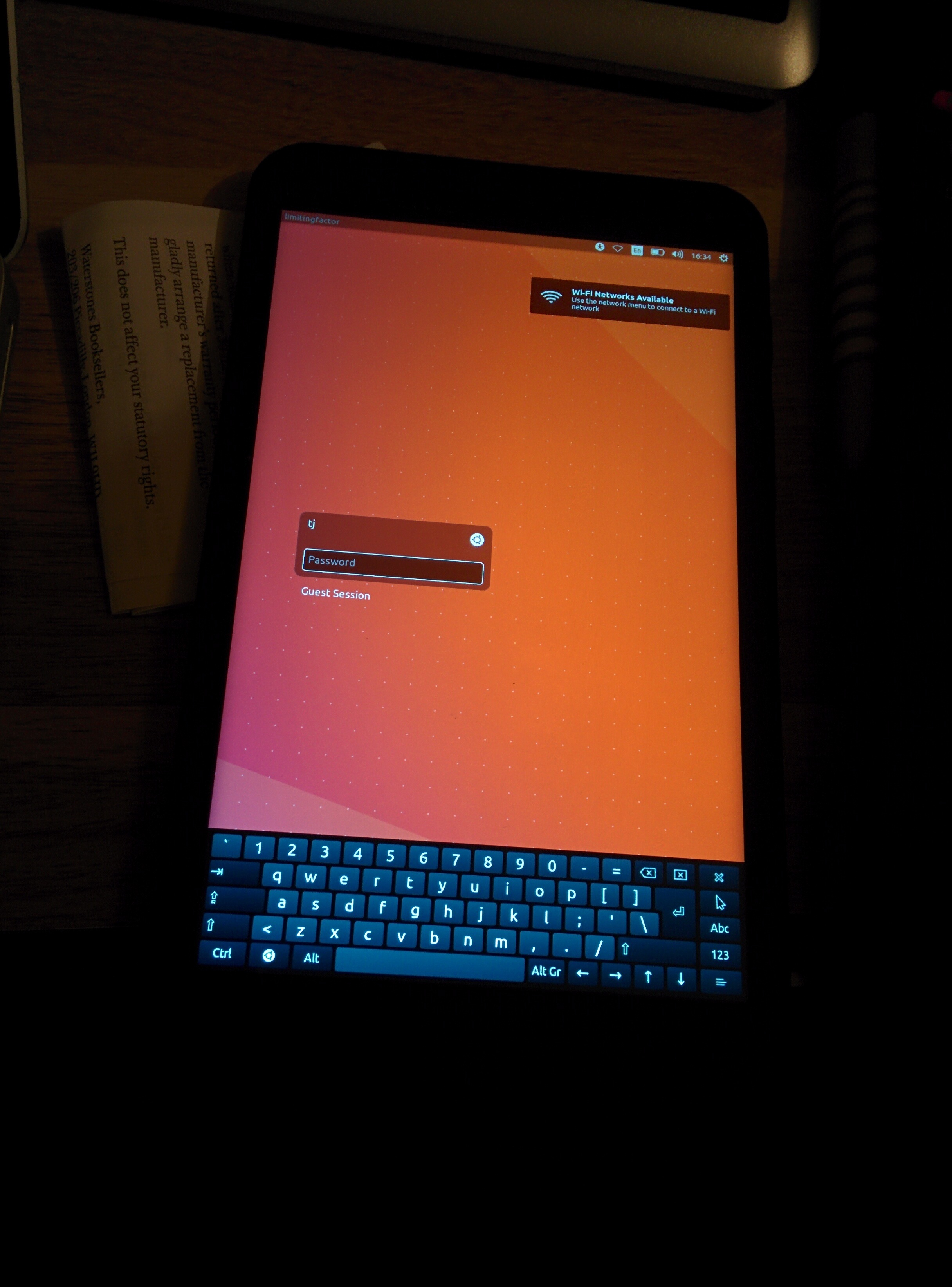 I needed a separate keyboard for the install, but the touch screen and WiFi worked out of the box. The hardware support is okay, there is no screen brightness control out of the box and suspend is missing. I spent a while setting up the on screen keyboard onboard , it looks like I am going to have to create my own layout to get a split keyboard.